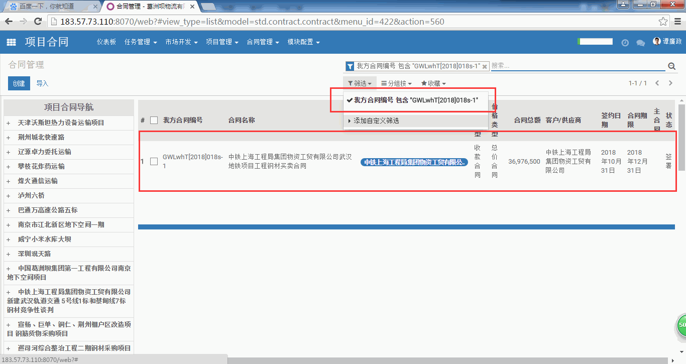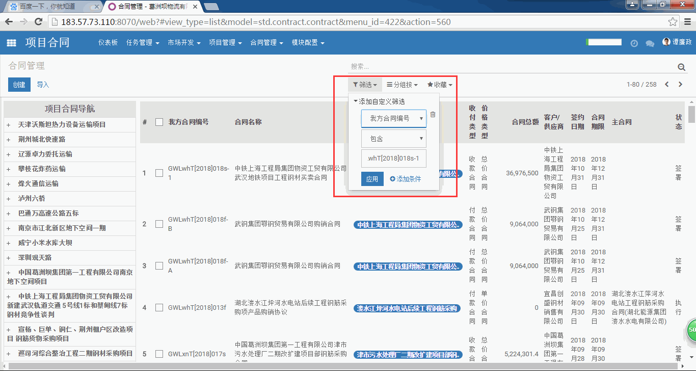 筛选功能:筛选功能是利用需要筛选单据的各种属性来进行筛选搜索,如合同的合同名称、我方合同编号、收付类型、相关项目等属性,通过给某个属性一个值,如给出你想搜索的我方合同编号的值,那么就会筛选出这个编号的合同。筛选功能的关键在于使用能够确定那张单据的唯一属性值,如合同的我方合同编号,入库单的入库编号等等,具体操作如图。