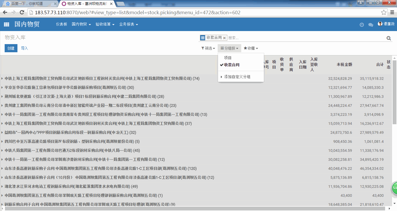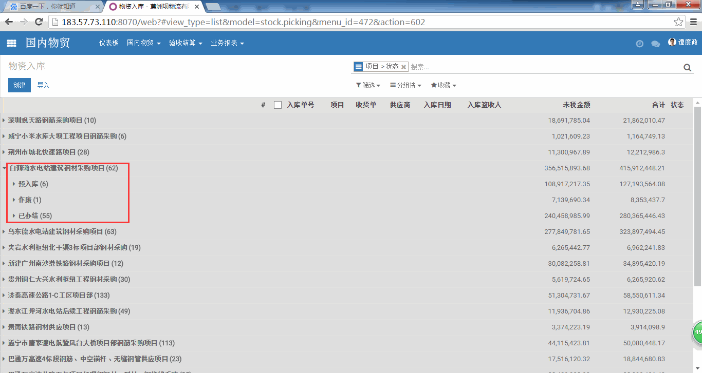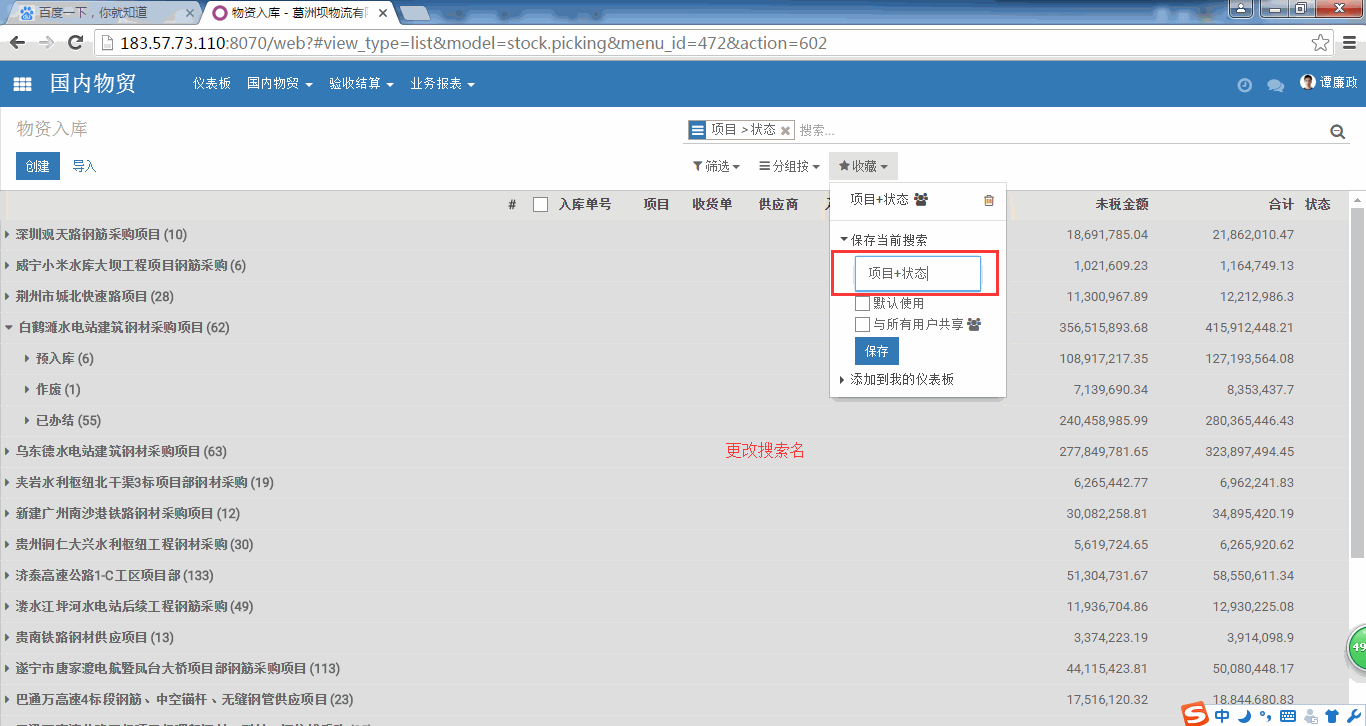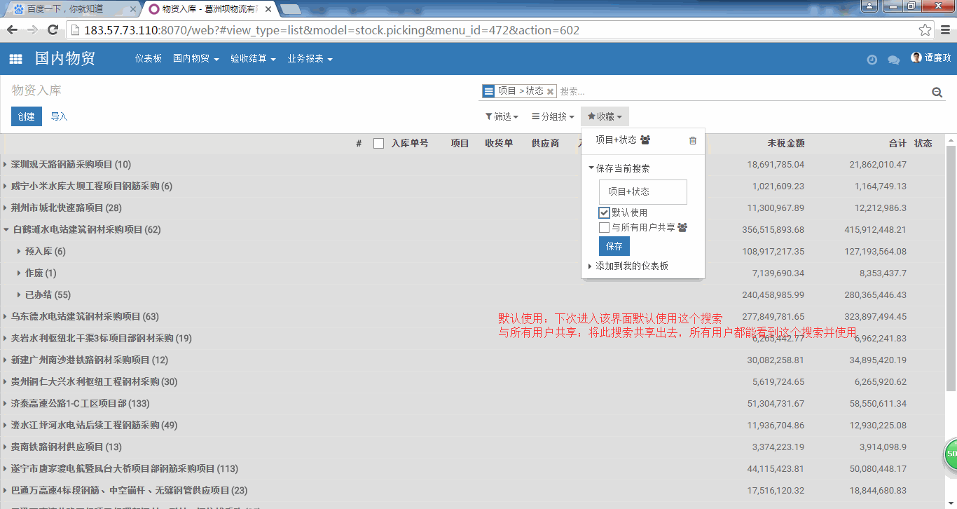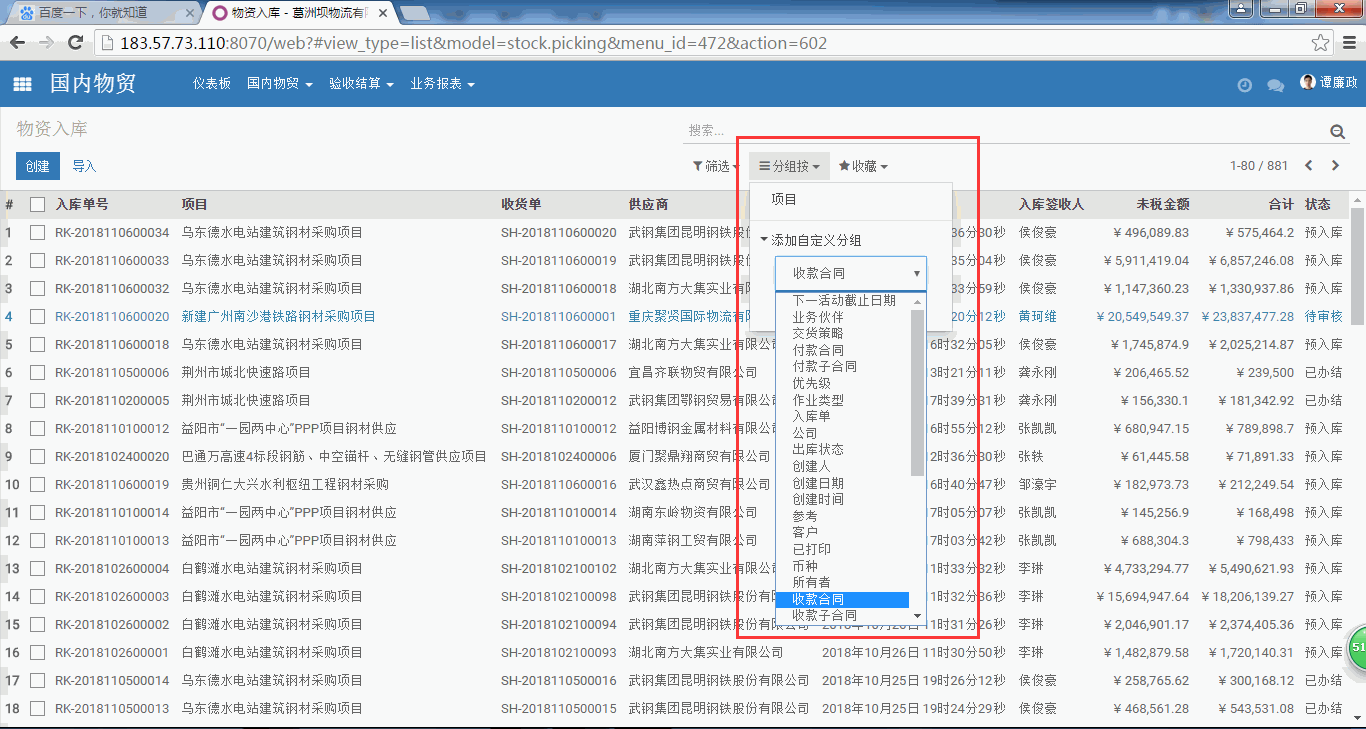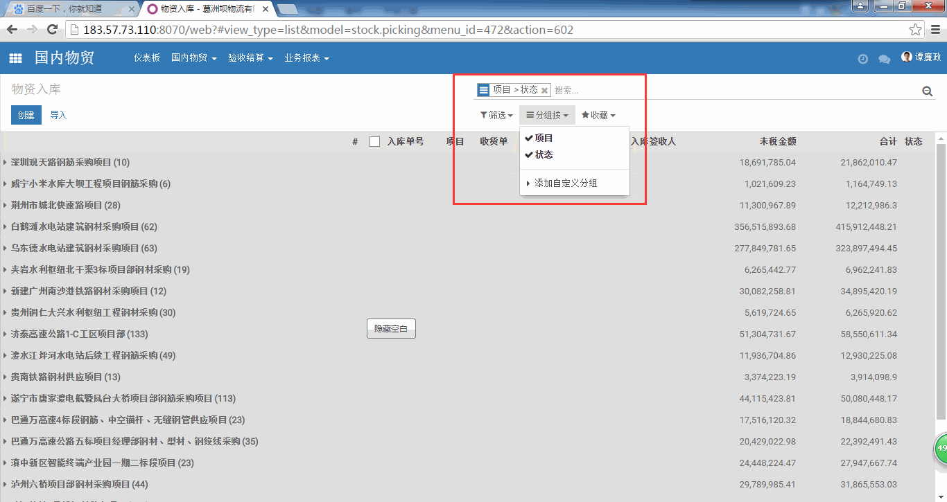叠加:为了使搜索更加灵活,搜索还能进行筛选和分组的不断叠加,当你进行了某个分组之后,比如按项目进行分组后,你如果还想在项目分组底下进行状态分组,那么继续进行状态分组就可以将这两个分组叠加起来,这样可以让我们更方便地找到我们想要的单据,具体操作如图。