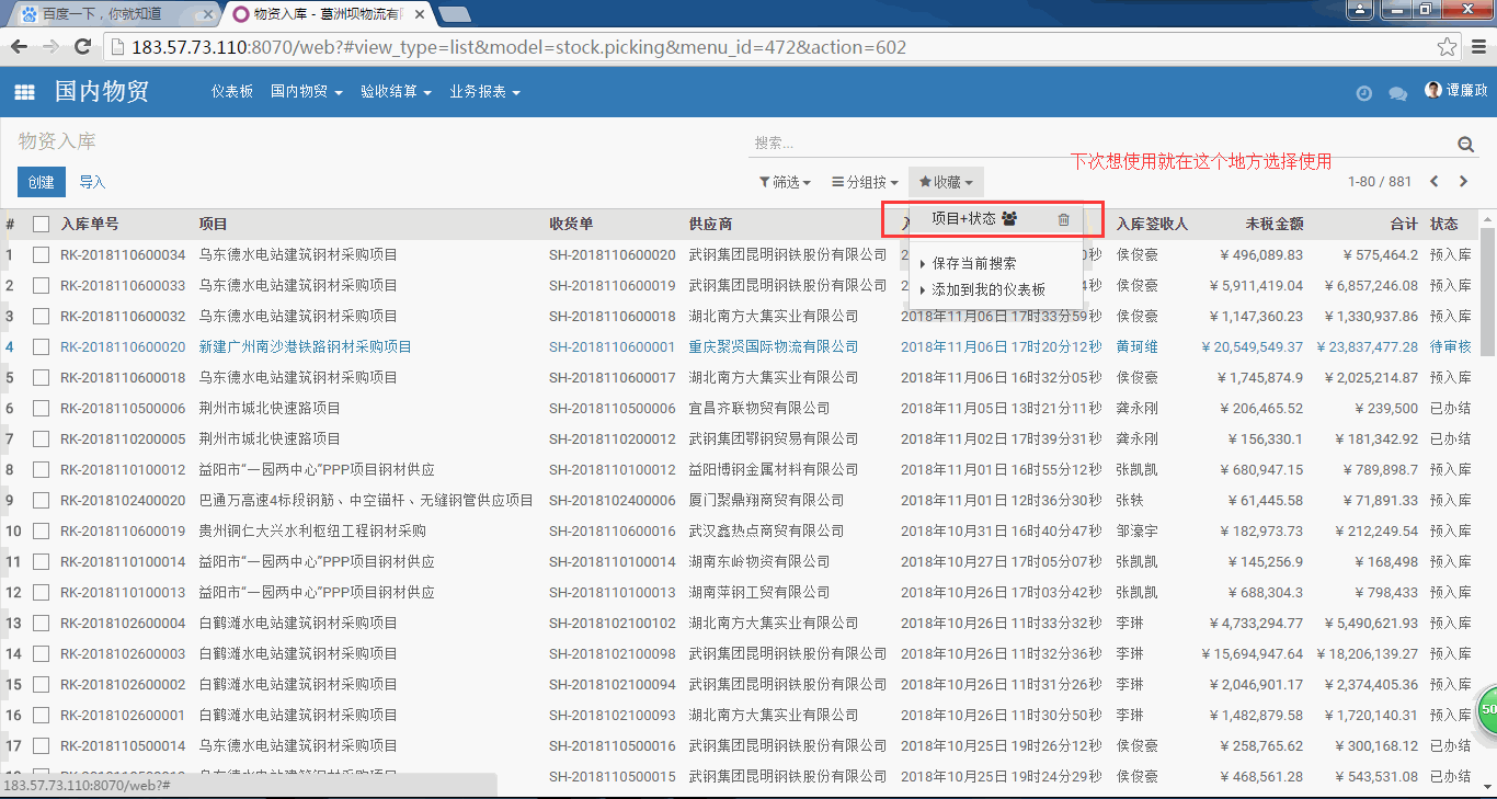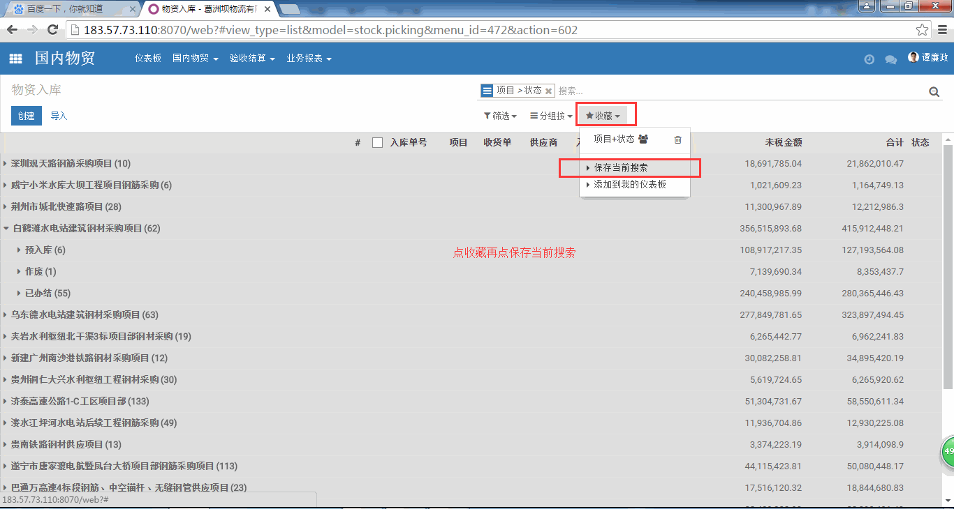 收藏功能:当你经常要使用某一个搜索时你可以使用收藏功能将这次搜索保存起来,例如我经常会用到项目+状态的分组叠加搜索,因此我将它收藏起来以便下次使用,具体操作如图。